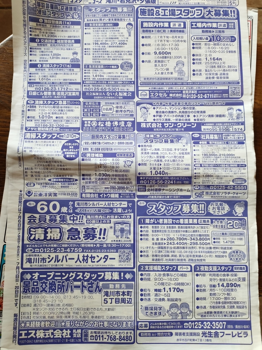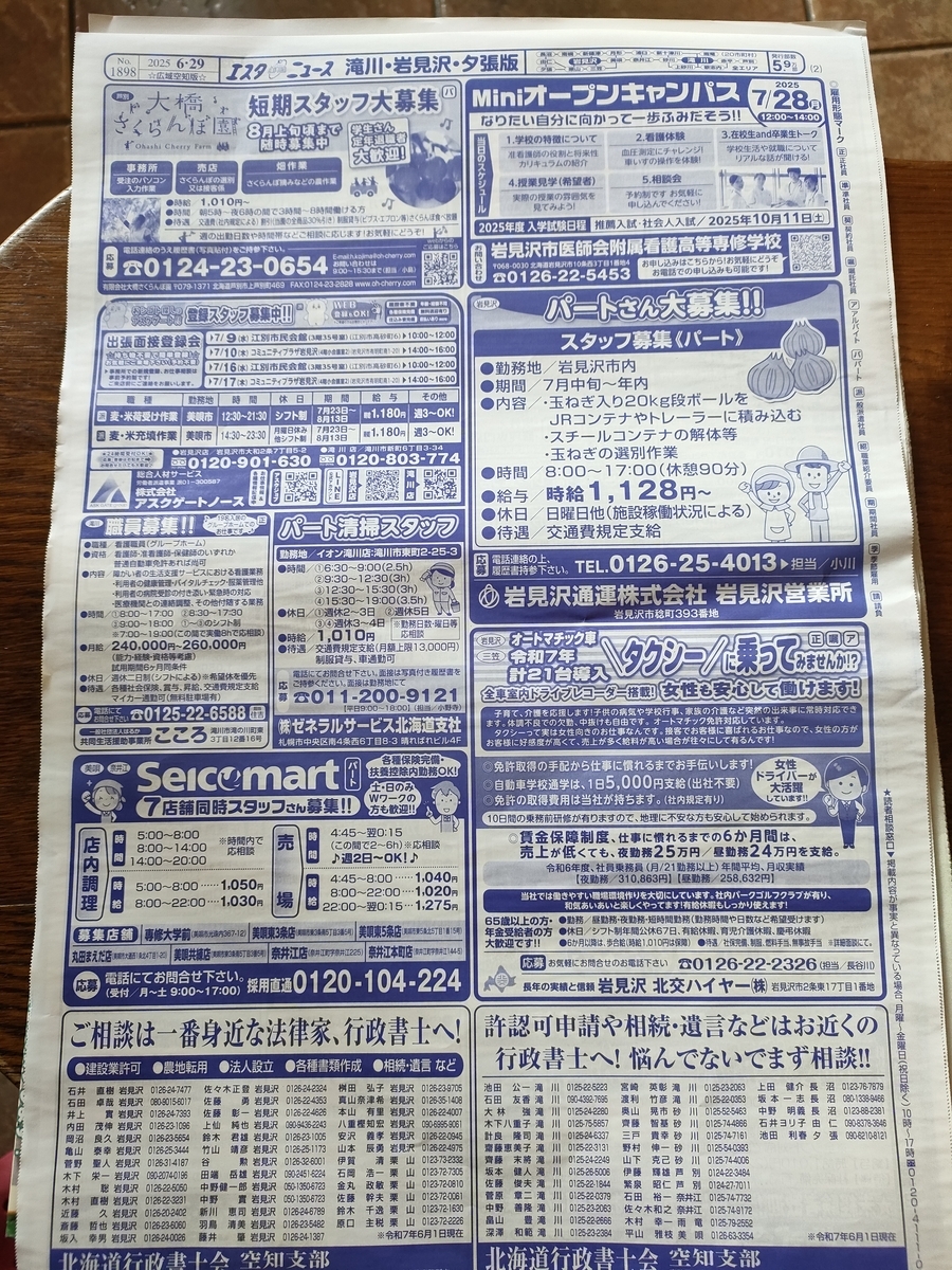 夕張の求人広告は、玉ねぎ運搬季節パート、コンビニパート、清掃パート、介護…